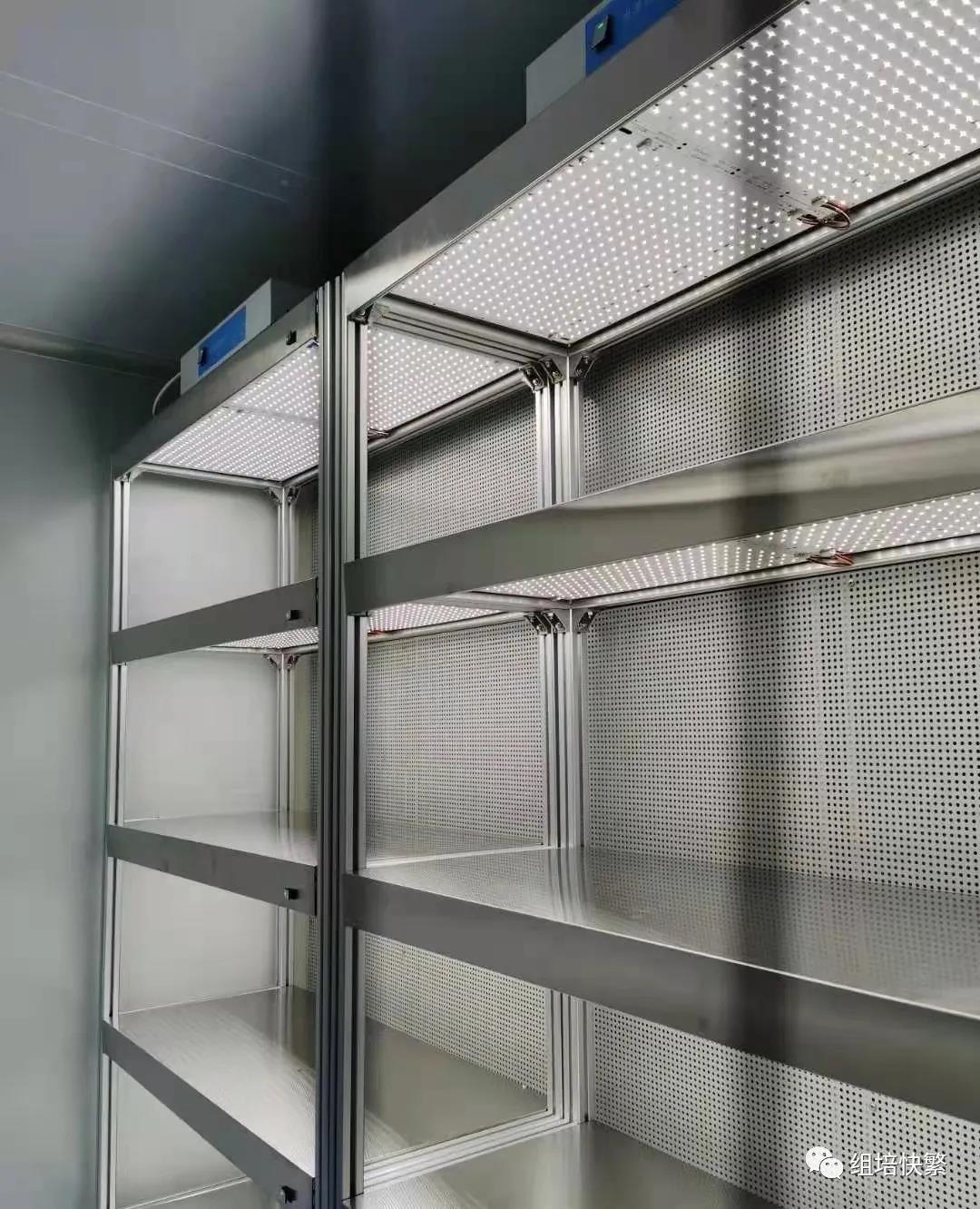 采用歐標鋁型材作為整體框架主材料,立柱規格:40×40*2mm,表面電泳處理。耐腐蝕。表面光潔度高,無毛刺,無需二次加工。每層置物板下方配備LED植物專用生長光源,使用壽命長,節能,光照均勻性好。置物板配備鏡面不銹鋼,耐腐蝕。每層置物板高度調節由四個角的滑塊連接件進行松緊調節,無需額外螺絲孔,表面干凈,美觀,無毛刺不割手。置物板前部設有遮光系統,可以有效防止光照的逃逸從而造成實驗人員的刺眼等損傷。每層置物板的右側配備主光、輔光調光器,弱電,DC24V,供電安全。