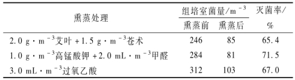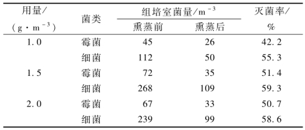設(shè)置3個(gè)艾葉用量梯度1.0,2.0,4.0 g.m-3和3個(gè)蒼術(shù)用量梯度1.0,1.5,2.0 g.m-3,分別測(cè)定組培室空氣的含菌數(shù),獲取艾葉和蒼術(shù)的優(yōu)化用量。比較艾葉和蒼術(shù)聯(lián)合熏蒸法與甲醛高錳酸鉀熏蒸法、過氧乙酸熏蒸法的滅菌效果。