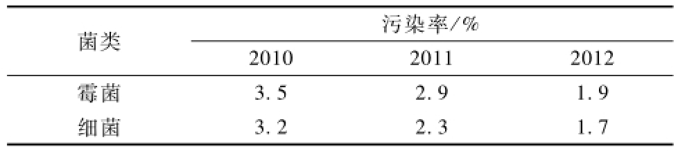 由表4可知,與2010年相比,2012年金線蓮組培苗細(xì)菌污染下降率為1.5百分點(diǎn),霉菌污染下降率為1.6百分點(diǎn)。艾葉與蒼術(shù)聯(lián)合熏蒸法對(duì)金線蓮組培生產(chǎn)空氣滅菌效果較佳,適用于金線蓮組培苗工廠化生產(chǎn)。