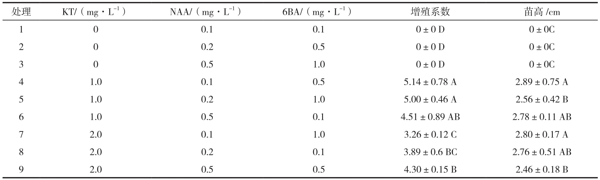 以MS為基本培養(yǎng)基,添加植物生長調(diào)節(jié)劑KT、NAA和6 BA,KT濃度設(shè)定為0、1.0、2.0 mg/L,NAA濃度設(shè)定為0.1、0.2、0.5 mg/L,6 BA濃度設(shè)定為0.1、0.5、1.0 mg/L。按照正交表 L9( 34) 設(shè)計成 9 種不同的處理。將誘導(dǎo)的芽單獨切離下來接種到培養(yǎng)基上,每個處理接種30個芽,分別接種在5個培養(yǎng)瓶中,每瓶接種6個芽,重復(fù) 3 次。30 d 后調(diào)查其增殖倍數(shù)和生長情況。