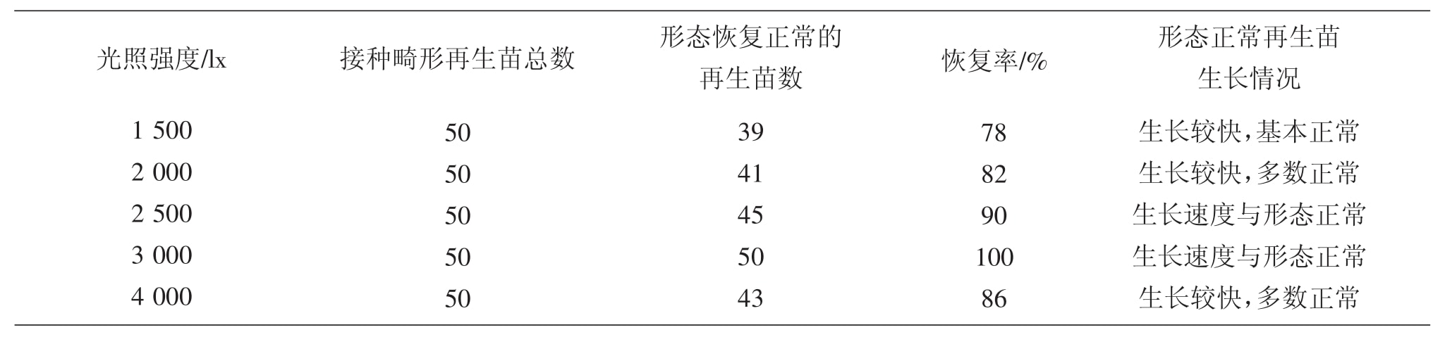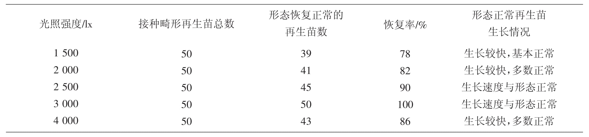 從表2可以看出,冰燈玉露形態(tài)正常率較高,原因主要是由于試驗采用的培養(yǎng)基為MS附加0.25 mg·L-1的BA,因此,組培苗形態(tài)普遍變得較為正常;但在不同溫度下,形態(tài)正常苗的比例有所不同,當(dāng)溫度為20℃時,獲得的形態(tài)正常的組培苗數(shù)多,而隨著溫度的增加,組培苗恢復(fù)率也逐漸下降,到28℃時,僅有38%。說明冰燈玉露形態(tài)建成培養(yǎng)的溫度應(yīng)采用較低的溫度。在試驗中,也曾采用18℃進行培養(yǎng),但結(jié)果顯示,幾乎所有組培苗都停止生長,只有個別生長正常,說明過低溫度也不利于冰燈玉露組培苗的形態(tài)建成。雖然在20℃時可以獲得較高的冰燈玉露組培苗的恢復(fù)率,但也因溫度較低,組培苗生長速度較慢,也不是理想的培養(yǎng)條件。為此,試驗又采用不同光照強度來提高形態(tài)重建率,希望獲得較高、較快的冰燈玉露形態(tài)重建培養(yǎng)。