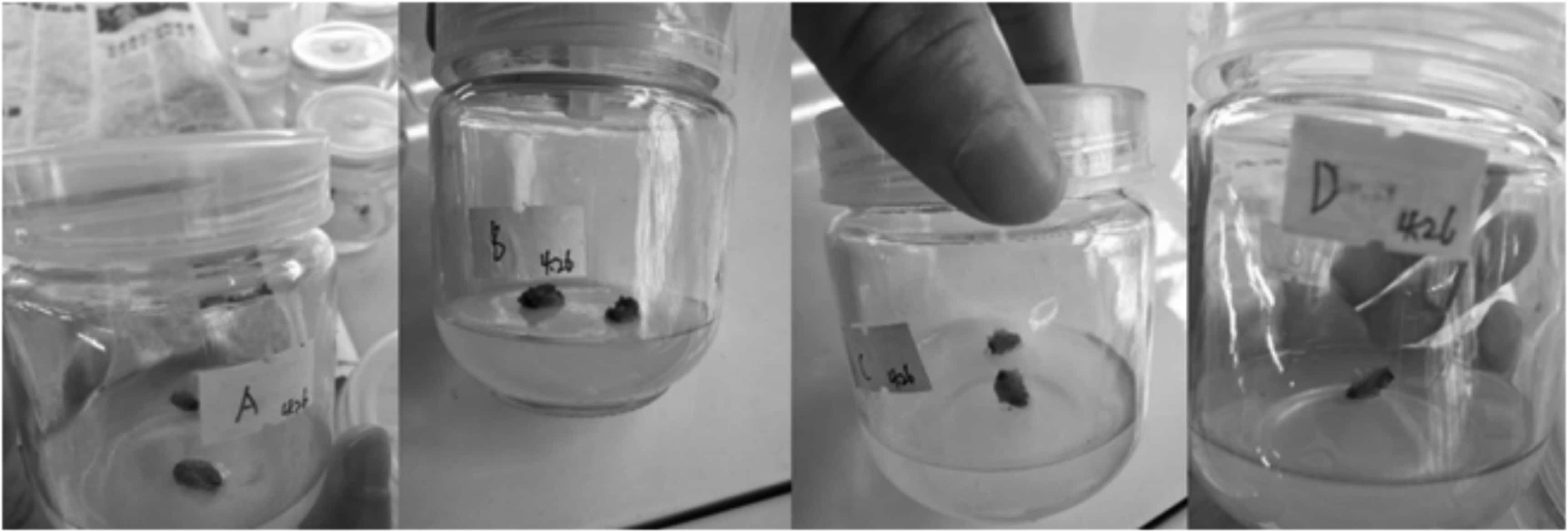 1.2.1 礬根初代培養(yǎng)誘導(dǎo)試驗設(shè)計從日光溫室里種植的四種礬根植株上選取生長健康的莖段作為外植體。用流水沖洗干凈,將外植體轉(zhuǎn)入超凈工作臺,用75%酒精清洗30 s,用無菌水清洗3次后備用。以MS為培養(yǎng)基,添加3種不同激素配方進行培養(yǎng),共12個處理。接種后置于已滅菌的培養(yǎng)室培養(yǎng),培養(yǎng)條件溫度在25±2 ℃之間,空氣相對濕度55%左右。