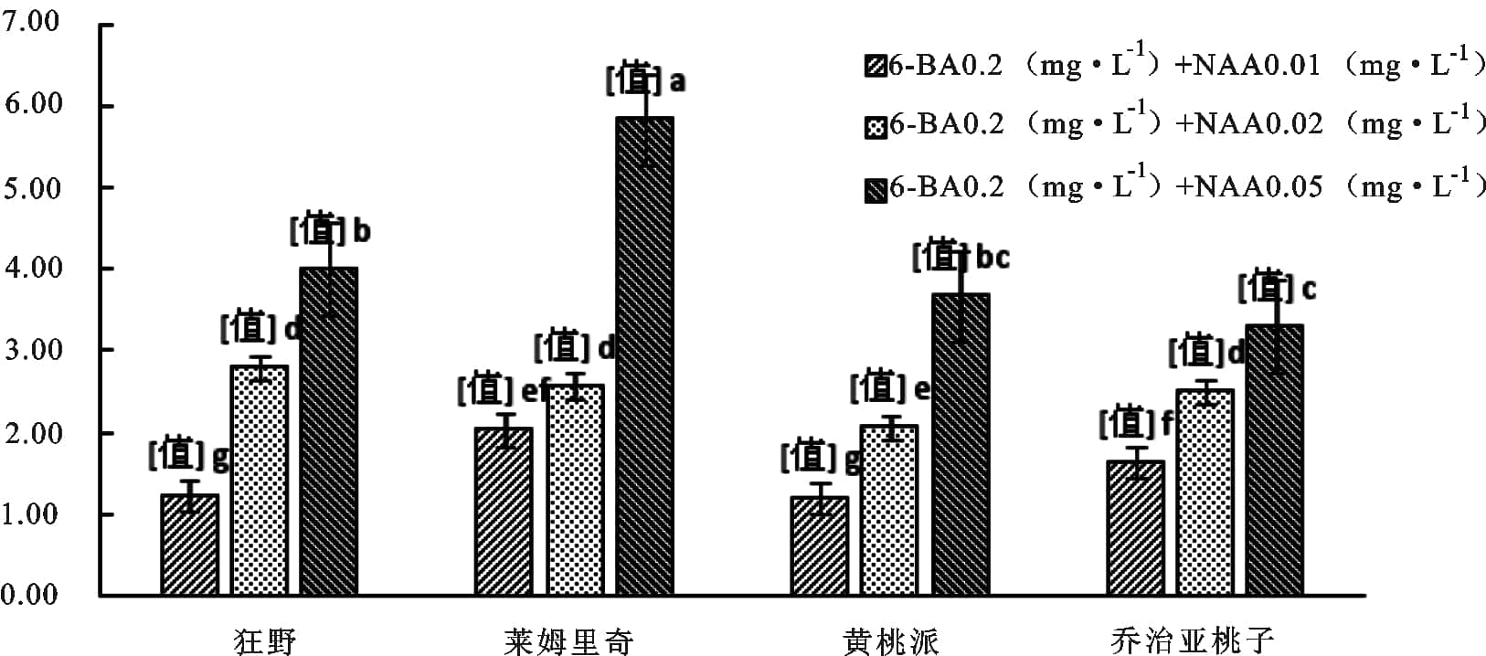 統(tǒng)計分析結(jié)果發(fā)現(xiàn),品種與激素之間的互作差異顯著,進一步分析兩因素的互作效應(yīng),其中B品種萊姆里奇采用6-BA0.2 mg·L-1 +NAA 0.05 mg·L-1的誘導(dǎo)率最高,可達5.83,C品種“黃桃派”采用6-BA0.2 mg·L-1 +NAA0.01 mg·L-1的誘導(dǎo)效果最差,分析結(jié)果見圖3。