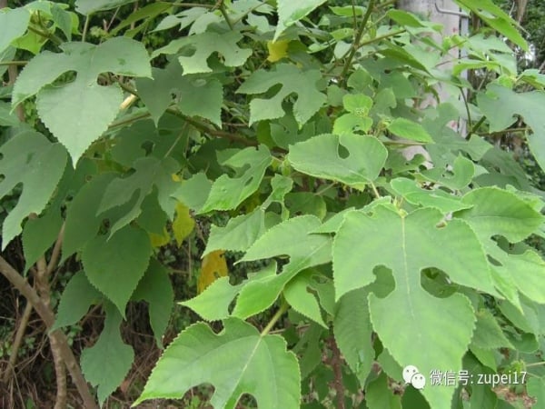 葉螺旋狀排列,廣卵形至長(zhǎng)橢圓狀卵形,長(zhǎng)6-18cm,寬5-9cm,先端漸尖,基部心形,兩側(cè)常不相等,邊緣具粗鋸齒,不分裂或3-5裂,小樹之葉常有明顯分裂,表面粗糙,疏生糙毛,背面密被絨毛,基生葉脈三出,側(cè)脈6-7對(duì);葉柄長(zhǎng)2.5-8cm,密被糙毛;托葉大,卵形,狹漸尖,長(zhǎng)1.5-2cm,寬0.8-1cm。